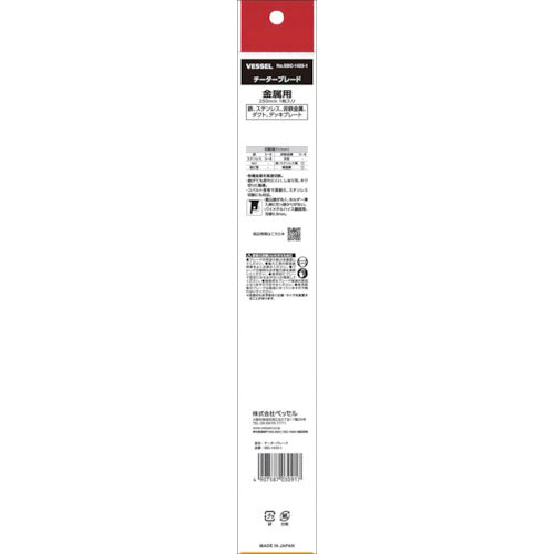 Catalog number: SBC-1425-1 Features: ● Can cut various metals at high speed. ● Flexible blade that can cut edges. ● Made of bimetal of cobalt high speed steel and spring steel, the blade has excellent durability. ● R-shaped corners that do not get caught when attached to the holder. ● Icons that indicate the purpose are displayed. ● QR code is printed to access product information. Uses: ● For cutting various metals. ● For repairing water pipes, cutting deck plates, removing electrical conduit, etc. Specifications: ● Number of teeth: 14 ● Total length (mm): 250 ● Thickness (mm): 0.9 ● Effective blade length (mm): 230 ● Cutting capacity (mm) Non-ferrous metal steel: 3-8 ● Cutting capacity (mm) Stainless steel: 3-8 ● Cutting capacity (mm) Stainless steel pipe/iron: 3.0-8.0 ● Hardness of blade tip: 920HV Material/Finish: ● Bimetal high speed steel