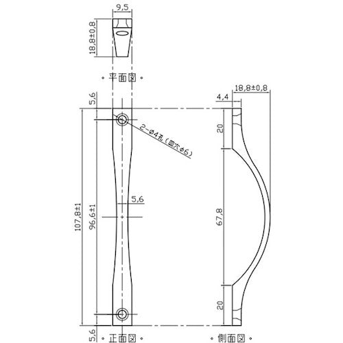 Catalog number: BH-821 Features: ●Can be used to remodel furniture drawers such as chests of drawers. ●Beautiful curves and a gentle design that makes it difficult to hang clothes. Specifications: ●Total length (mm): 107.8 ●Color: Silver ●Width (mm): 9.5 ●2-hole pitch (mm): 96.6 ●Standard (mm): 108 ●Screw pitch (mm): 96.5 ●Compatible door thickness (mm): 20 or more Material/Finish: ●Zinc die-cast Note: ●The product illustration in the dimensional diagram may differ from the actual shape.