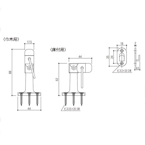 Catalog number: BH-838 Features: ●One screw can be easily used for both floor mounting and baseboard mounting. Uses: ●For interior doors. Specifications: ●Color: Amber ●Total length (mm): 87 ●Width (mm): 55 ●Height (mm): 42 Material/Finish: ●Body: Zinc die-cast Set contents/Accessories: ●5 screws (3 large, 2 small)