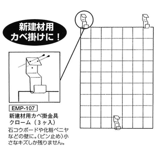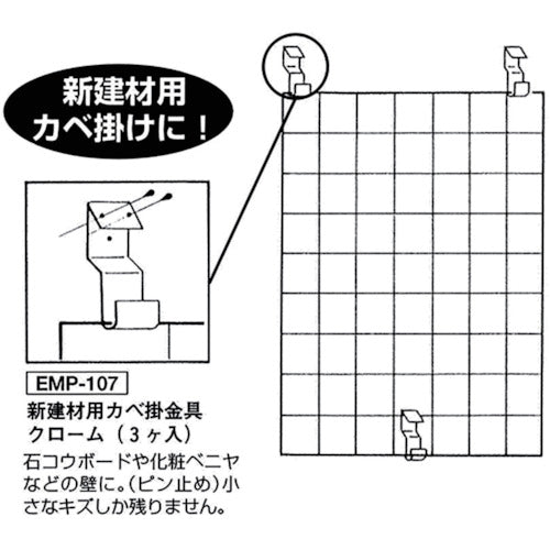 Catalog number: EMP107 Features: ●Pin-type. ●Hooks exclusively for mesh panels. ●You can display and store everyday bags, hats, and small items. Uses: ●Use with mesh panels to store tools and tape measures. Specifications: ●Color: Chrome plated ●Width (mm): 20 ●Name: New building materials wall hook ●Length (mm): 46 ●Type: For new building materials ●A (mm): 20 ●B (mm): 46 ●Load capacity (kg): 5 ●Load capacity: 5kg Material/Finish: ●Steel (chrome plated) Set contents/Accessories: ●3 metal fittings included Caution: ●Please refrain from hanging from this as it is very dangerous. ●Do not hang dangerous, heavy, or fragile objects. ●Do not install near fire. ●If it gets dirty, wipe it lightly with a cloth soaked in diluted neutral detergent.