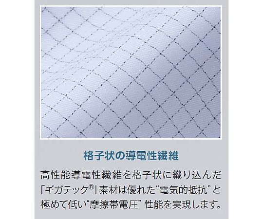 Cleanroom clothing made from highly antistatic and dust-proof material with conductive yarn woven in a grid pattern.