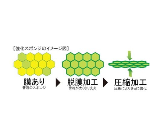 The pad surface is made of "reinforced sponge" instead of typical non-woven fabric. Non-woven fabric does not produce fiber debris, has excellent abrasion resistance, and is suitable for preventing foreign matter from entering. The large size allows you to quickly wash large areas of laundry. This product does not contain abrasive particles, so it is less likely to scratch the items being cleaned. For preventing foreign matter contamination and color zoning at food manufacturing sites, etc. For cleaning sites that require high durability. For cleaning items that you do not want to scratch, such as melamine tableware. Color: Yellow Length (mm): 123 Width (mm): 83 Thickness (mm): 30 Highly durable compressed sponge pad bonded sponge scrubber Material/Finish: Polyurethane Country of Origin: Japan Code number: 103-0054
