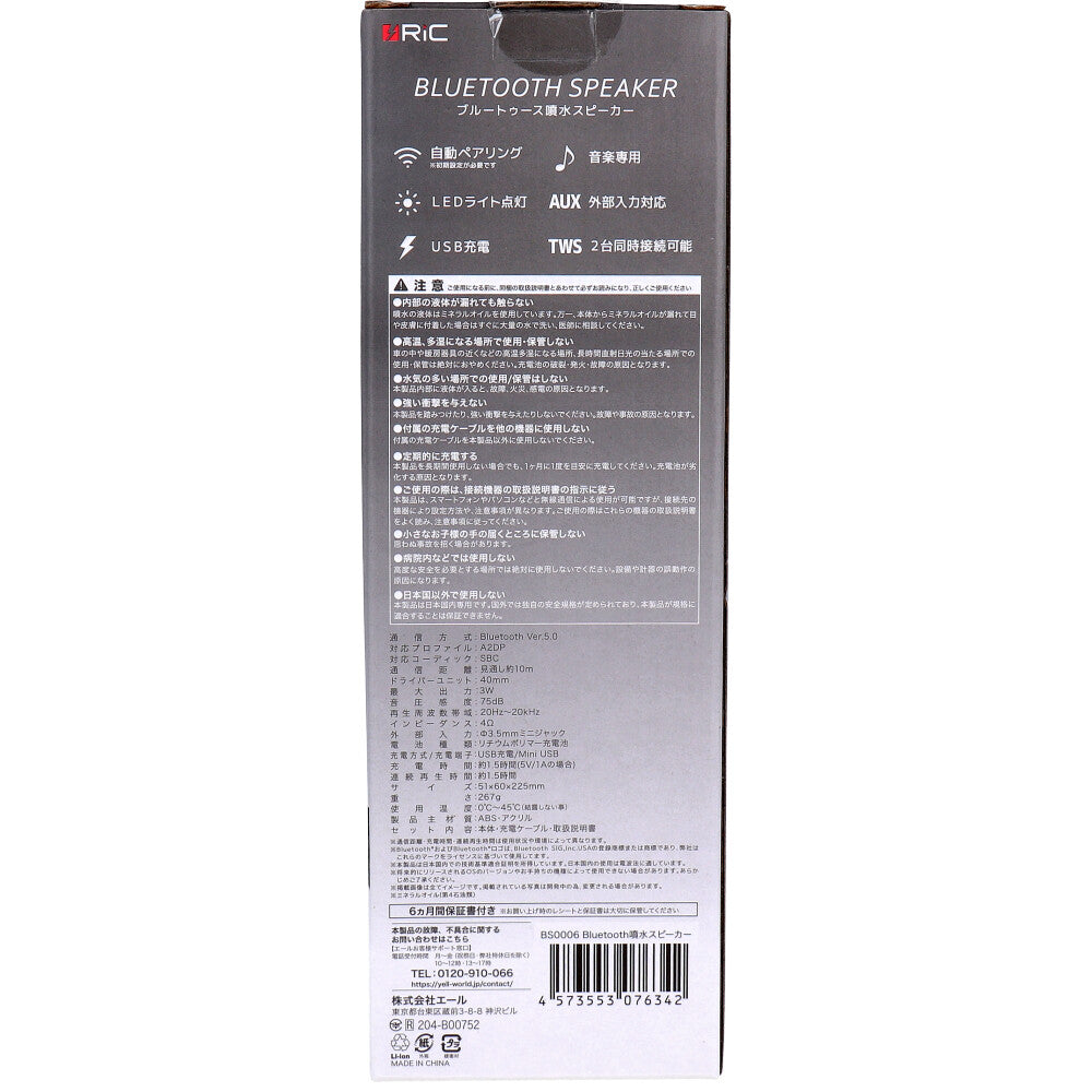 The water dances according to the volume. The force of the water changes with the volume. *Automatic pairing. *Initial setup required. ●LED light turns on ●USB charging ●For music only ● Supports external input ●TWS: Two devices can be connected simultaneously. *Two of this product are required. ●Bluetooth Ver.5.0 ●Continuous playback time: Approximately 1.5 hours [Specifications] Communication method: Bluetooth Ver5.0 Supported profiles: A2DP Supported codec: SBC Communication distance: Line of sight approx. 10m Driver unit: 40mm Maximum power output: 3W Sound pressure sensitivity: 75dB Frequency response: 20Hz to 20kHz Impedance: 4Ω External input: Φ3.5mm mini jack Battery type: Lithium polymer rechargeable battery Charging method/charging terminal: USB charging/MicroUSB terminal Charging time: Approximately 1.5 hours (5V1A) Continuous playback time: Approximately 1.5 hours Size: 51 x 60 x 225 mm Weight: 267g Operating temperature: 0 to 45 degrees (no condensation) Main material: ABS, acrylic Set contents: Main unit, charging cable, instruction manual [Caution] - Before using, be sure to read the instruction manual included and use it correctly. ・Do not touch the internal liquid even if it leaks The fountain liquid contains mineral oil. If mineral oil leaks from the unit and comes into contact with your eyes or skin, immediately wash with plenty of water and consult a doctor. ・Do not use or store in places with high temperatures or humidity. Do not use or store the battery in hot and humid places such as inside a car or near a heater, or in places exposed to direct sunlight for long periods of time. Doing so may cause the battery to explode, catch fire, or break down. ・Do not use or store in wet places. If liquid gets inside this product, it may cause malfunction, fire, or electric shock. ・Do not subject to strong impacts Do not step on this product or subject it to strong impacts, as this may cause breakdowns or accidents. ・Do not use the included charging cable with any other device. Do not use the included charging cable for any product other than this product. ・Charge regularly. Even if you do not use the product for a long period of time, we recommend that you charge it about once a month, as this can cause the rechargeable battery to deteriorate. - When using, follow the instructions in the instruction manual of the connected device. This product can be used via wireless communication with smartphones, computers, etc., but the setting method and precautions vary depending on the connected device. When using this product, please read the instruction manual of the device carefully and follow the precautions. ・Do not store within reach of small children. This may lead to an unexpected accident. ・Do not use in hospitals, etc. Do not use this product in locations where a high level of safety is required, as it may cause equipment or instruments to malfunction. ・Do not use outside of Japan. This product is for use only in Japan. Outside of Japan, each country has its own safety standards, and we cannot guarantee that this product complies with those standards. *Communication distance, charging time, and continuous playback time vary depending on usage and environment. *Bluetooth(R) and the Bluetooth(R) logo are registered trademarks or trademarks of Bluetooth SIG.Inc.USA, and any use of these marks is under license. *This product has been certified as conforming to technical standards in Japan. Use in Japan complies with the Radio Law. *Please note that it may not be possible to use this function depending on the OS version released in the future or the model you have. *Mineral oil (Class 4 petroleum product)