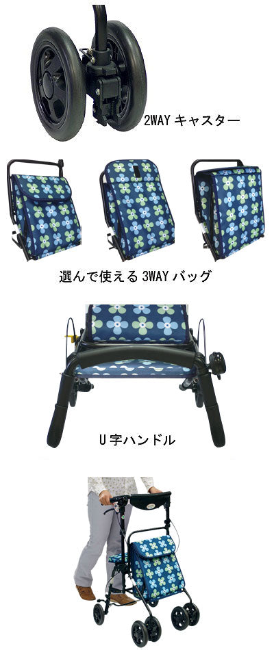 ●표준 기능/접이식, 2WAY 캐스터(좌우 60°・고정), 수중 브레이크, 주차 브레이크, 좌면, 지팡이・우산 세우, 보냉, 벨(경음기)