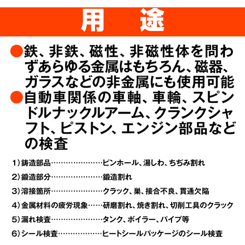 카탈로그 품번:000145 특징:●염색 침투 탐상제 ●특수한 장치는 일절 불필요하므로, 실내・옥외를 불문하고 사용할 수 있습니다. ● 취급이 간단하므로 쉽게 사용할 수 있습니다. ●육안으로는 발견할 수 없는 미세한 결함도 선명한 붉은 색으로 지시되기 때문에, 쉽게 상처를 발견할 수 있어 간과가 없습니다. ●피검사물의 재질이나 형상, 마무리의 여하에 관계없이 사용할 수 있습니다. ● (도장면, 플라스틱 제외). ●원터치 에어로졸식이므로, 사용이 간단하고 휴대에 편리합니다. ●부식하기 쉬운 알루미늄 합금, 마그네슘 합금에 대해서도 안전하게 사용할 수 있습니다. ●검사 결과는 닦아내지 않는 한 그대로 보존할 수 있습니다. ●검사 감도는 상처 폭 1.5μm, 깊이 30μm【JIS Z 2343-2 준거】 최고 감도의 감도 레벨 2(시험 온도 범위-20℃~50℃의 결과) ) 단조 부분 : 단조 균열 3) 용접 개소 : 균열, 둥지, 접합 불량, 관통 결함 4) 금속 재료의 피로 현상 : 연마 균열, 구이 균열, 절삭 공구의 균열 5) 누출 검사 : 탱크, 보일러, 파이프 등 6) 씰 검사 : 히트 씰 패키지의 씰 검사 ● 유형: 스프레이 ●용량: 420ml 재질/마무리: ● 에탄올, 실리카, 탄산칼슘