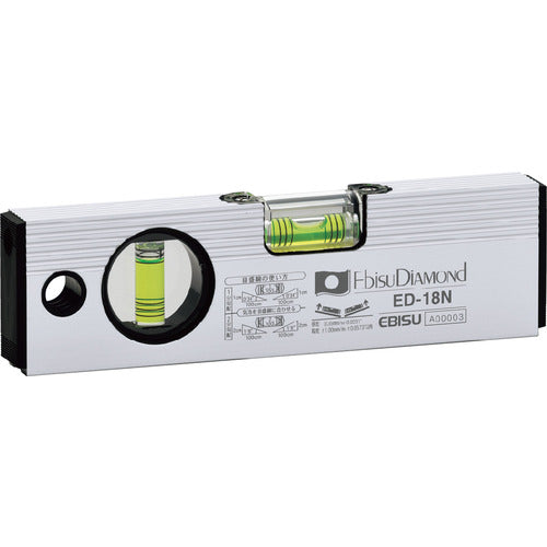 카탈로그 품번:ED-18N 특징:●수지제 플랫형 사이드 캡 부착으로 건재 등을 손상시키지 않습니다. ●6본선 기포관은, 구배의 1/100(1분 구배)・2/100(2분 구배)를 측정할 수 있습니다. ● 확대 렌즈 부착으로 매우 보기 쉽습니다. ●정밀도의 조정 기구 부착으로 매우 편리합니다. ● 측정 기준면이 V 홈 부착으로 파이프 등의 측정을 할 수 있습니다. ● 축광 부착으로 밝은 곳에서 빛을 축적하고 어두운 곳에서 몇 분간 발광합니다. ●수평 기포관은 확대 렌즈 첨부로 보기 쉽습니다. 용도: ●수평・수직의 측정에. 사양:●길이(mm):180●높이(mm):51●두께(mm):19.5●마그넷:없음●본체색:실버●기포관색:그린 MA) ●캡: ABS 수지 ● 프로텍터: 엘라스토머 수지