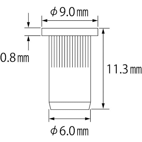 카탈로그 품번:NSD4RMP 특징:●소프트한 세팅으로 박판, 연질 모재용에 최적입니다. ●선단 테이퍼로 되어 있으므로, 하공에 들어가기 쉽고 자동 치기 등에 최적입니다. ●몸통부에 들어간 널링에 의해, 모재를 갓치리그립하므로, 공회전이 하기 어려워지고 있습니다. (단 조건에 따릅니다) ● 필요할 때 필요한 수만큼 요구하실 수있는 소량 팩 포함입니다. ●몸통부의 널링이, 코킹 리브 형성의 가이드가 되어, 설치를 편하게 할 수 있습니다. ●튼튼한 수지 케이스들이로 보관에 편리합니다. 용도 : ● 자동차의 강판 부, 수지 부 (범퍼 등)에 부품 설치에. ● 외관 등 알루미늄 건축 자재에 부품 설치에. ●박판에 액세서리의 설치, 파이프와 평판의 접속, 농구·기구의 수평출 등에. 사양 : ● 코킹 판 두께 (mm) : 0.5 ~ 2.5 ● 하부 홀 직경 (mm) : 6.1 ● 적합 나사 : M4 × 0.7 ● 너트 외경 (mm) : 6.0 ● 전체 길이 (mm) : 11.5 ● 플랜지 두께 (mm) : 0.8 ● 팩 입수 (개) : 9.9. 강도(kN):6.7 ●팩입 ●평두 재질/마무리: ●스틸(SWCH) 주의: ● 적정 코킹 판 두께, 하공 직경은 당사 지정 치수를 지켜 안전율을 충분히 고려하여 시공해 주십시오. ●작업 전에 반드시 공구(너터)의 취급설명서를 잘 읽어 주십시오. ●치수・중량 등은 공칭치이므로, 약간의 수치의 상하가 있습니다.