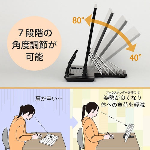 카탈로그 품번:BKS-820-K 특징:●서적이나 자료, 타블렛의 고정에 편리한 북 스탠드입니다. ●배면 스탠드는 7단계(40도~80도)의 각도 조정을 할 수 있기 때문에, 태블릿의 빛의 반사를 억제하거나, 시선을 아래로 옮기지 않고 올바른 자세를 유지합니다. ●서적을 유지하는 암은 좌우 독립해 가동하므로, 페이지수가 치우쳐 있어도 확실히 고정할 수 있습니다. ●배면 스탠드를 쓰러뜨리는 것으로 두께 19 mm가 되어 운반이나 수납에도 편리합니다. 사양:●색:블랙●안길이(mm):151●높이(mm):174●플랫시 두께(mm):19●간구(mm):211●7단계의 각도 조정이 가능한 배면 스탠드 ●좌우 독립 암 재질/마무리:●스탠드 보드:스틸