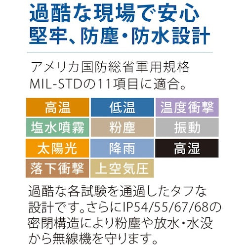 카탈로그 품번:TPZ-D563BT 특징:●편리한 Bluetooth를 탑재하고 있습니다. ● 항균 · 항 바이러스 가공으로 비즈니스에서 레저까지 안심입니다. ● 업계 톱 클래스의 얇은 디자인입니다. 사양:●색:블랙●폭(mm):56●안길이(mm):28.4●높이(mm):92●안테나 길이(mm):114●중계기 대응:비대응 ●시가지 통화 거리(km):0.5~1 ●교외 통화 거리(km):1~4 ):허가된 351MHz대 ●채널수:30●통화 타입:교호통화●배터리(mAh):1800●출력:5W/1W(전환 가능)●방진・방수 기능부(IP54/55/67/68) ●전원:충전식 입니다.