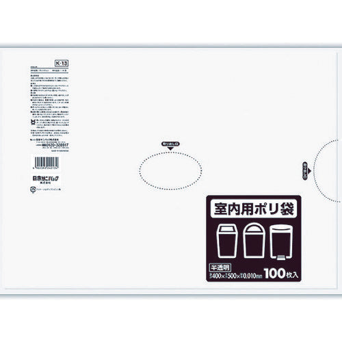 카탈로그 품번:K-13 특징:●얇은 타입의 실내용의 폴리봉투입니다. ● 사무소 등의 쓰레기통에 최적입니다. 사양:●세로(mm):500●가로(mm):400●두께(mm):0.01●용량(L):10●색:반투명●1권:100장입 재질/마무리:●고밀도 폴리에틸렌(HDPE)