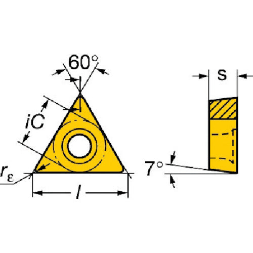 카탈로그 품번:TCMW 16 T3 04FP 특징:●긴 공구 수명, 양호한 마무리면을 실현했습니다. 용도: ● 일반 선삭 비철금속 가공용. ● 마무리 및 중간 마무리 용. 사양:●적합 피삭재:N●팁 형상:삼각형 ●절삭날 유효길이 LE(mm):4.2●내접원 IC(mm):9.525●두께 S(mm):3.96875●코너 반경 RE(mm):0.3969●홀 직경 D1(mm):4.4●주 도출각 (mm):3.96875 ●날 길이(mm):4.2 ●칩 탈출각(°):7 ●가공 형태: 마무리 절삭 ●다결정 다이아몬드 재종