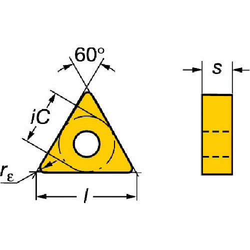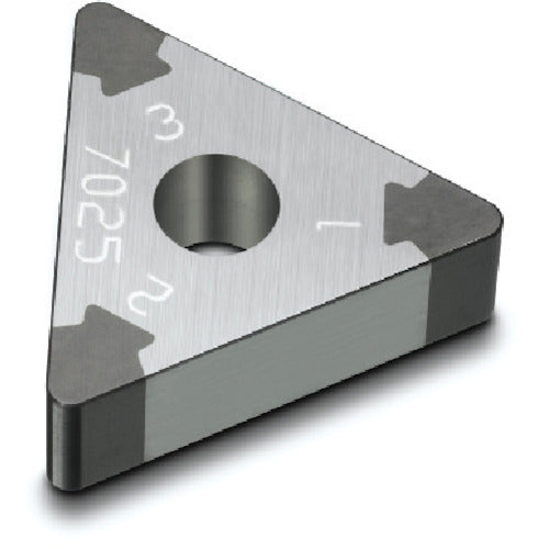 카탈로그 품번:TNGA160408S01030A 특징:● 높은 가공 성능을 발휘하는, CBN 함유량이 중간 정도의 재종입니다. 용도: ● 일반 선삭 고경도 강철 가공용. ●단속 중절삭 가공 또는 중속 연속 절삭 가공용. 사양:●적합 피삭재:H●칩 형상:삼각형 ●절삭날 유효길이 LE(mm):2.7 ●내접원 IC(mm):9.525 ●두께 S(mm):4.7625 ●코너 반경 RE(mm):0.7938 ●홀 직경 D1(mm):3.81 ●주 도출각 AN(°):0 7625 ●날 길이(mm):2.7 ●칩 도출각(°):0 ●가공 형태: 마무리 절삭 ●CBN칩