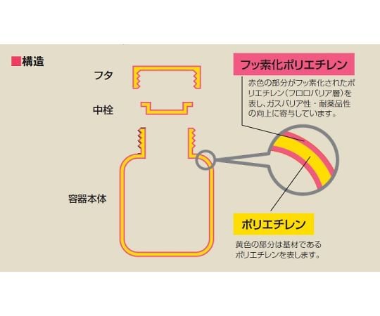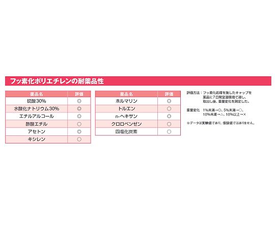 폴리에틸렌 용기의 표면을 불소화하여 내유기 용해성, 가스 배리어성, 내약품성을 높인 광구 폴리용기 불소화 처리된 표면층은 영구적으로 효과를 발휘 ※표면층의 상처나 긁힘은 효과 상실의 원인이 됩니다. 취급에는 주의해 주십시오. 불소 병의 약 1/5 가격으로 합리적인 불소화 처리의 로트 번호를 상품에 명기 용량:250mL 재질:(본체, 캡) 고밀도 폴리에틸렌(표면 불소화 처리), (중전) 저밀도 폴리에틸렌(표면 불소화 처리) 구내 직경(mm):φ31 외경×전체 높이(mm):63×121H 표준: 250mL 중간 마개: 있음