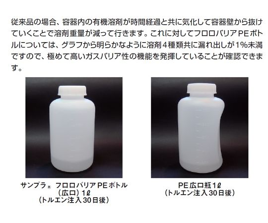 폴리에틸렌 용기의 표면을 불소화하여 내유기 용해성, 가스 배리어성, 내약품성을 높인 광구 폴리용기