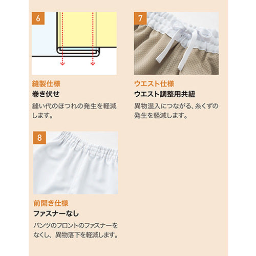 카탈로그 품번:LT-793-A9-L 특징:●이중 구조에 의해 통기성을 낮추고, 보온 효과를 올린 소재입니다.●밀도가 높은 면을 사용한 높은 보온성 소재를 사용하고 있으므로, 겹쳐 입지 않아도 따뜻합니다. ●소재 이물 혼입 방지 사양 풀 스펙입니다. (추위 대책·항균·제전). 용도 : ● 이물질 혼입 방지, 체모 낙하 방지를 높은 수준에서 요구되는 식품 공장에. 사양:●색:화이트●사이즈:L●허리(cm):77~84