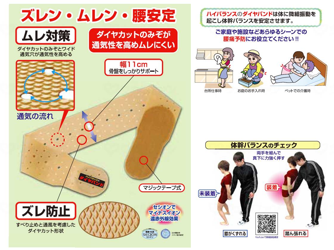 메이커 품번:「H-DB-S」 코멘트 미세 진동 가공 기술에서 태어난 고 밸런스 다이어 밴드 하이 밸런스 다이어 밴드는 신체에 미세 진동을 일으켜 몸통 균형을 안정시킵니다. 가정이나 시설 등 모든 장면에서 요통 예방에 도움을주세요! ! 부엌 일시 정원 청소시 침대에서의 개호시 ●유치원, 보육원의 보육 작업시 ●의료・개호의 현장 작업시 ● 무거운 짐을 가질 때 폭 11cm 골반을 확실히 서포트 매직 테이프식 세시온에서 음이온 원적외선 효과 ○ 무레 대책 다이아몬드 컷의 너비와 넓은 통풍구가 통기성을 향상시킵니다. ○ 어긋남 방지 미끄럼 방지와 통풍을 고려한 다이어컷 패턴 재질·원재료 본체: 천연 고무, 세시온 착탈부:매직 테이프, 나일론 표준 1개 규격 상세 ○사이즈:폭 11×길이 83 cm ○웨스트:64~76cm ○골반 주위:78~88cm 사용방법 <사용 방법> ● 속옷 위에서 장착하고 요골 곳에 감아주세요. ● 장시간 사용하는 경우는 적당히 착탈을 반복하십시오. 보충 정보 원산지:일본 고베제