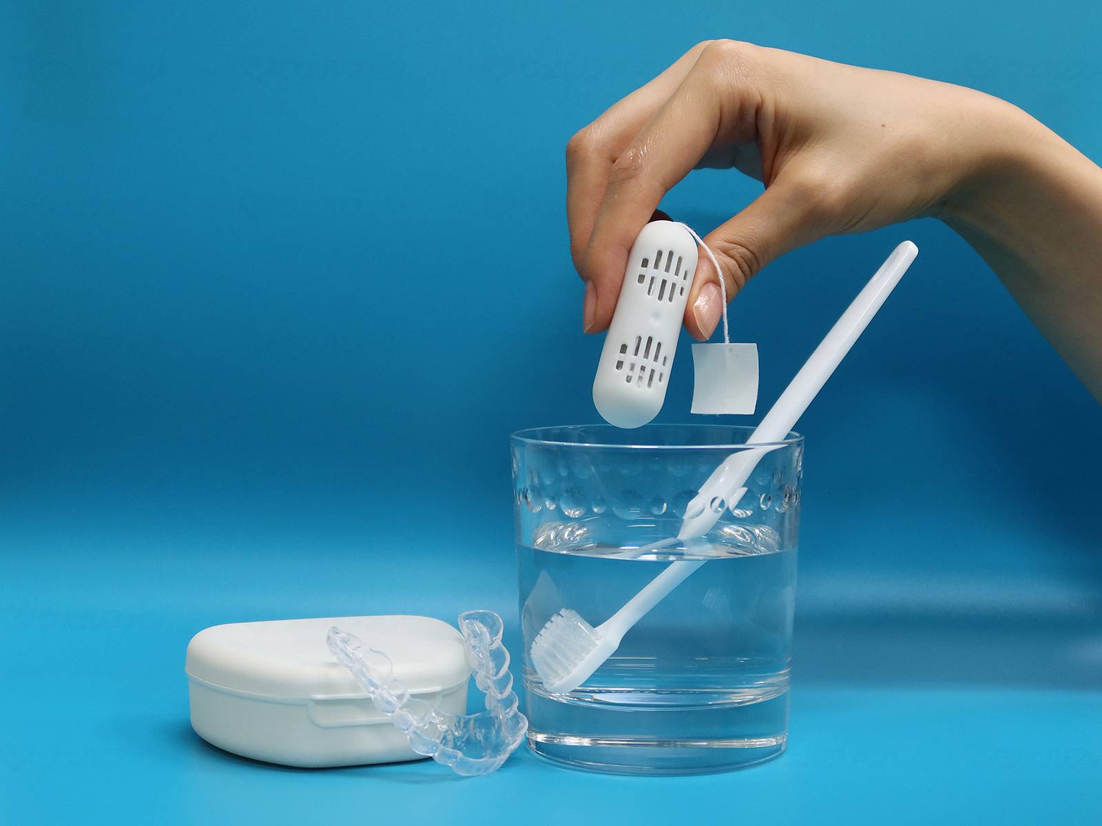 컵에 물을 부어 제균 스틱을 넣고 칫솔 마우스피스를 담그는 것만으로 손쉽게 제균을 실현합니다.