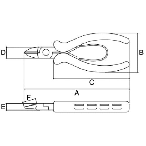 카탈로그 품번:CR-01 특징:●와이어크래프트용으로 개발한 니퍼입니다. ● 여성도 취급하기 쉽도록 가볍게되어 있습니다. 용도 : ● 와이어 크래프트 (침금 공작) 전용으로 개발 된 니퍼입니다. ● 알루미늄 철사의 절단 (φ4.0mm)을 안전하고 깨끗하게 할 수 있습니다. 사양:●전장(mm):133.5 ●칼날 표면 형상:라운드 칼날 ●절단 능력(mm) 연철선:○● 절단 능력(mm) ABS 수지:○● 절단 능력(mm) 철선:φ1.5 ●절단 능력(mm) 구리선:φ2.6 ●절단 능력([[MM2]]) 구리보다 선:2.0●낙하 방지용 운드날 ●플라스틱제 스프링 부착 ●치수(mm):A=133.5/B=50/C=96/D=14/E=8.3/F=17 재질/마무리: ●바나듐강 ●그립:엘라스토머 수지 주의: ●절대로 전기를 통과시키지 마십시오. 비절연 공구입니다. ● 해머 대신 사용하지 마십시오. ●사용 범위를 넘어 사용하지 마십시오.