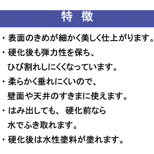 카탈로그 품번:SY-026 특징:● 매끄럽고 사용하기 쉽습니다. ● 고무 모양으로 굳어집니다. ● 돌출해도, 경화 전이라면 물로 닦아낼 수 있습니다. ●경화 후에는 수성 도료의 도장이 가능합니다. ●JAIA F☆☆☆☆ 규격품입니다. 용도 : ● 벽 · 천장 · 틈새 · 깨끗한 충전. ● 기둥과 벽의 틈새에. ● 천장 주위의 틈새에. ●베니아의 합계에. ● 목재, 콘크리트, 슬레이트, 블록, 타일 등. 사양:●색:화이트●용량(ml):333●수성 아크릴 수지계 실링재의 카트리지 타입