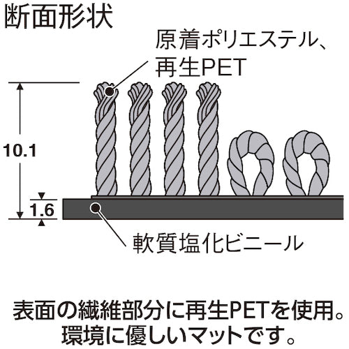 카탈로그 품번:MR-026-146-5 특징:●구두창에 붙은 물기를 빨리 흡수합니다. ● 탈색 · 퇴색하기 어렵습니다. ● 재생 PET 사용하고 있습니다. 용도: ●우천시의 현관이나 통로, 화장실, 화장실이나 목욕탕의 출입구용 매트. 사양:●색:그레이●폭(mm):900 ●길이(mm):1500●두께(mm):10.1