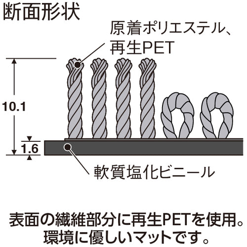 카탈로그 품번:MR-026-148-5 특징: ●구두창에 붙은 물기를 빨리 흡수합니다. ● 탈색 · 퇴색하기 어렵습니다. ● 재생 PET 사용하고 있습니다. 용도: ●우천시의 현관이나 통로, 화장실, 화장실이나 목욕탕의 출입구용 매트. 사양:●색:그레이●폭(mm):900●길이(mm):1800●두께(mm):10.1●진흙 구멍:없음●안감 첨부●파일:재생 PET50% 사용 ●진흙 구멍 구멍 없음 재질/마무리:●표면:폴리에스텔 100%