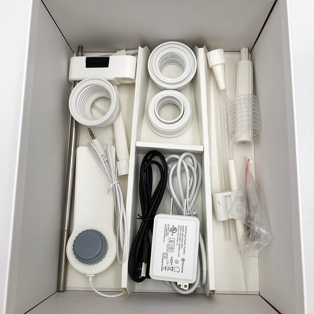 부속품:샤프트, 클램프, 회전자(20×6mm)×1개, 병 어댑터×5개(S40・GL25/28/32/38용), 배출 노즐 2종, AC 어댑터