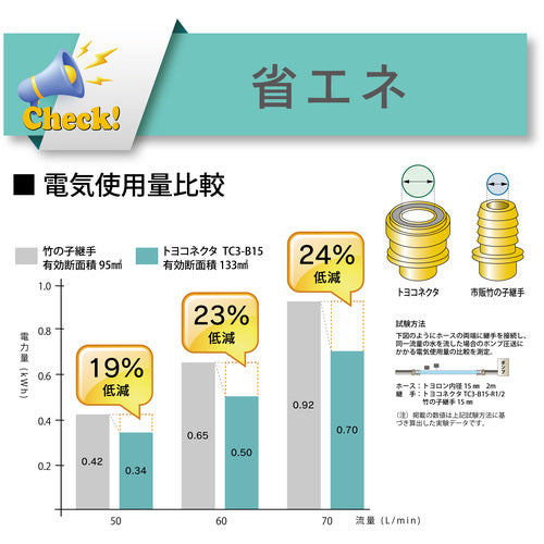 카탈로그 품번:TC3-B25-R3/4 특징:●토요쿠스호스(실리콘 호스 제외) 전용 피팅(수나사)입니다. ●【누설・빠짐 방지 호스 피팅】유체 누설이나 호스 누락 등의 생산 트러블을 방지해, 안정 생산이 가능한 호스용 피팅입니다. ●【설치 작업의 표준화】봉투 너트를 끝까지 조이는 것만으로, 균일한 설치 작업이 가능한 호스 피팅입니다. 또한 호스 밴드와 같은 늘어나는 작업도 필요하지 않습니다. ●【에너지 절약】 일반적인 대나무의 아이 피팅에 비해 유효 단면적이 넓고, 압력 손실을 작게 할 수 있으므로, 소비 전력의 저감 효과를 기대할 수 있습니다. ●【간단 설치】 종래의 피팅에 비해, 호스구가 호스와 동경이므로, 호스의 삽입이 쉽고 배관 시간을 단축할 수 있습니다. ●【리스크 저감】 진동, 지진에 의한 누설 누락 등의 배관 트러블을 방지합니다. ●재이용시에는 피팅 내부의 부품을 교환하는 것만으로 재이용할 수 있습니다. 용도:●급배수・유・약품・에어 등의 호스 배관용 사양:●사용 유체:공기, 물(공업용수), 기름●적합 호스 내경(mm):25●적합 호스 외경(mm):33 피팅 ●사용압력・사용온도범위:적합호스 규격에 준한다 재질/마무리:●니플, 가방너트:놋쇠(카드미레스 대응) ●고무 패킹:니트릴 고무(NBR) ●슬리브:폴리아세탈 주의:●본 제품은, 토요쿠스호스 전용의 호스 피팅입니다. 타사 호스 및 적합 호스 이외에 접속된 경우는, 성능을 충분히 발휘·유지할 수 없는 경우가 있기 때문에 아무런 보증은 하지 않습니다. ●피팅 부근에서 호스를 극단적으로 구부린 상태에서 사용하지 마십시오. 호스의 최소 굽힘 반경보다 큰 굽힘 반경으로 사용해 주십시오. ● 진동이나 충격이 발생하는 장소에서는 사용하지 마십시오. 피팅의 파손이나 호스 빠짐 발생의 우려가 있습니다. ● 본 제품의 재사용 시에는 반드시 패킹 부착 슬리브를 교환해 주십시오. 또한 반드시 신품 호스를 사용하십시오. ● 본 제품의 유로(내면)의 재질은 황동을 사용하고 있습니다. 유체의 종류에 따라 부식이나 유체 누설이 발생할 수 있습니다.