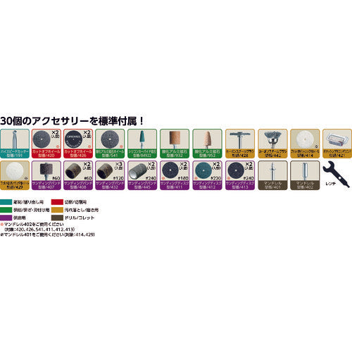 카탈로그 품번:3000-2/30-60 특징:●이지 트위스트 시스템 탑재, 렌치리스로 액세서리를 빠르고 간단하게 교환 가능합니다. ●쿨링 시스템의 개량에 의해 냉각 효율이 종래 대비 20% 향상, 내구성이 향상하고 있습니다. ● 소프트 고무 그립으로 펜처럼 가지고 사용할 때도 손에 저스트 피트합니다. ●최대 28000회전/분의 무단 변속으로 다양한 재료나 용도에 대응합니다. 고속 회전 속도로 작업은 빠르고 부드럽습니다. 사용: ● 조각/깎이. ● 모따기. ● 연삭/연마. ● 절단. ● 절삭. ● 얼룩 제거 / 연마. ● 연마. ● 드릴링. 사양:●무부하 회전수(min[[의 -1승]]):10000~32000●외경(mm):56●전체 길이(mm):188●전원(V):100(60Hz)●소비 전력(W):90●주파수(Hz):60●적합 콜릿(mm):0.8/1.6/2. : 3.0/3.2mm ●사용 가능 콜릿 지름: 0.8/1.6/2.4/3.0/3.2mm ● 30개의 액세서리가 표준 장비되어 있습니다. 재질/마무리: ●폴리아미드 수지 세트 내용/부속품: ●컷오프 휠 ●숫돌 ●샌딩 밴드 4종류 ●맨드릴 ●하이 스피드 커터 ●렌치 ●저장 케이스 ●액세서리 케이스 ●플렉스 샤프트 ●샌딩 글라이딩 가이드