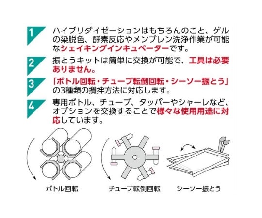 「병 회전・튜브 전도 회전・시소 진탕」의 3 종류의 교반 방법에 대응합니다.