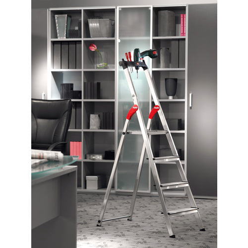 카탈로그 품번:L80-5 특징: ●위 테두리 첨부로 최상단도 안정감 발군입니다. ● 스텝 폭 130mm의 폭 넓은 타입입니다. ● 최대 사용 질량 150kg의 강력 타입입니다. 용도: ●사무소나 점포의 인후 간이 작업용으로. 사양:●최대 사용 질량(kg):150●천판 높이(m):1.07●천판 치수(mm):250×270 수납시 치수 높이(mm):1840 ●설치 치수 폭(mm):480 ●설치 치수 폭(mm) 깊이:1050