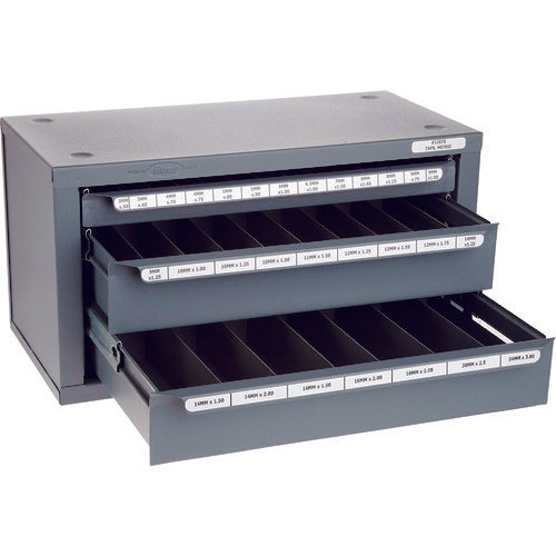 카탈로그 품번:13575 특징:●본체 상부에 움푹 들어간 곳, 하부에 돌기가 있어, 캐비닛을 연결할 수 있습니다. 용도: ● 탭 수납, 관리. 사양:●색:그레이 0.90, 6mm×1.00, 6.3mm×1.00, 7mm×1.00, 8mm×1.00, 8mm×1.25, 9mm×0.75, 9mm×1.00, 9mm×1.25, 10mm×1.00, 10mm×1.25, 10mm×1.50, 10mm×1.50 50, 12 mm×1.75, 14mm×1.25, 14mm×1.50, 14mm×2.00, 16mm×1.50, 16mm×2.00, 18mm×2.50, 20mm×2.50, 24mm×3.00) 재질/마무리: ●스틸(분체 도장)