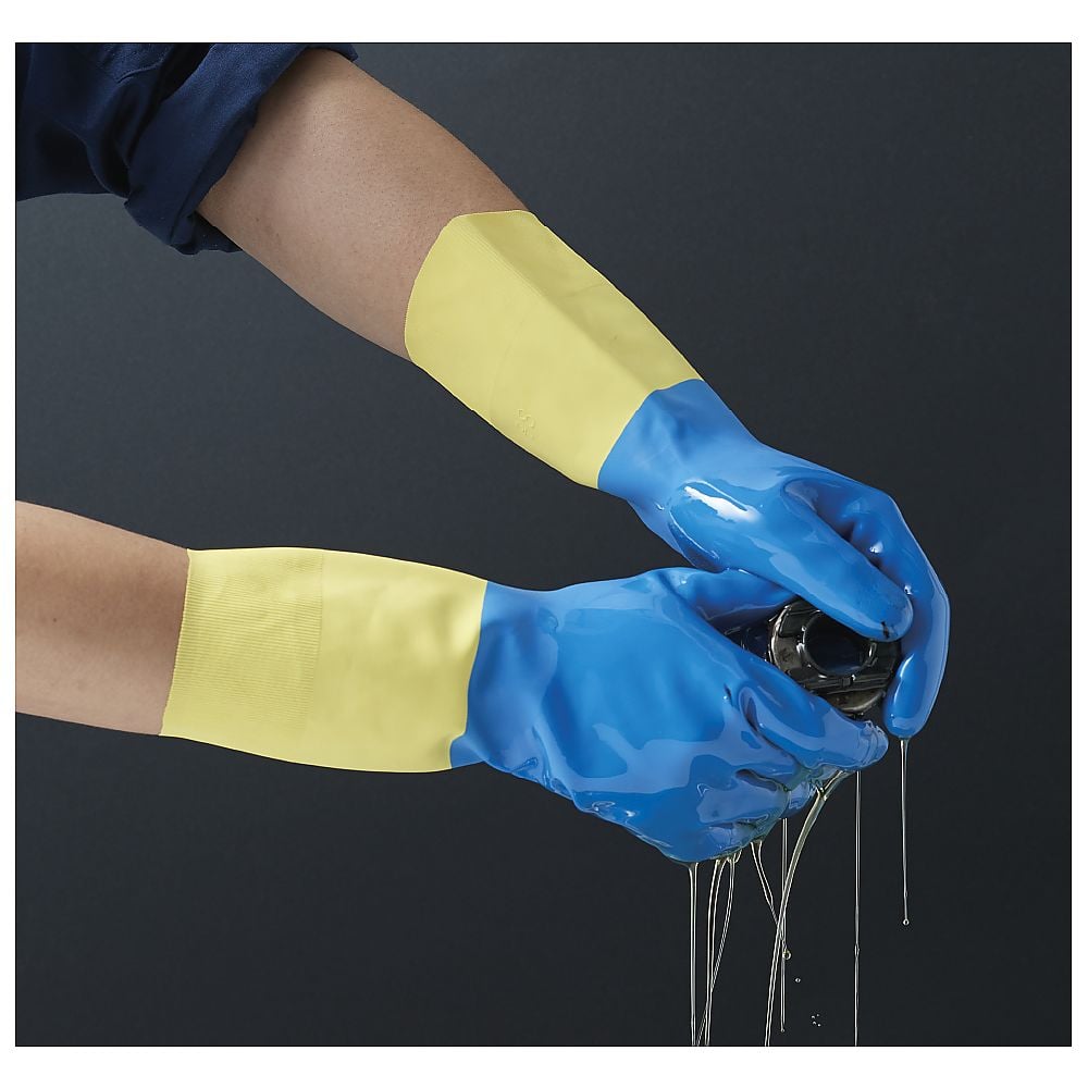 클로로프렌 코팅 가공(파란 부분)으로 광범위한 약품에 대해 우수한 보호 성능을 발휘합니다.