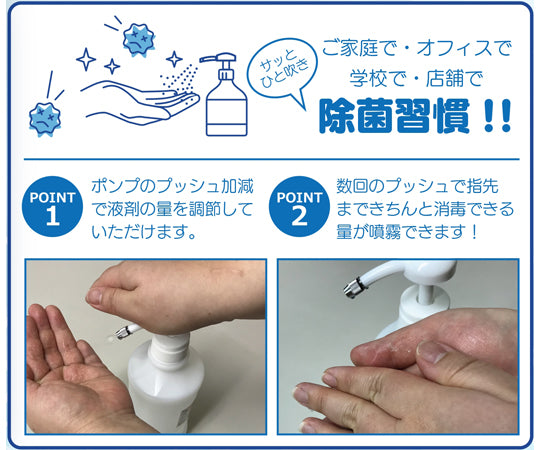 코로나 禍의 바이러스 대책의 필수품! 소독용 에탄올(알코올 제제) 전용 병! ! 가정용으로 설계된 심플한 각형 타입의 리필용 펌프식 스프레이 병입니다. 소독용 에탄올(알코올 제제)을 안개 모양으로 해 손가락의 소독을 할 수 있습니다! 펌프식 스프레이(안개)이므로 펌프의 가가감소에 필요한 액량을 조정하여 사용하실 수 있습니다! 몇 번의 푸시로 손가락 끝까지 제대로 소독할 수 있는 양을 분무할 수 있습니다. 플라스틱제 노즐로는 어려운 놋쇠제 노즐만이 가능한 세세한 안개를 분무 가능! ! 수용량: 400mL 색상: 화이트 재질 펌프 본체/폴리프로필렌, 노즐/황동 크롬 도금, 병/폴리에틸렌