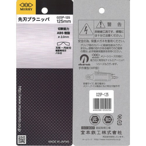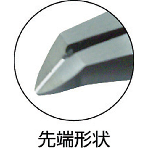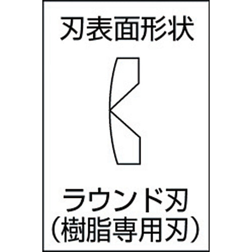 카탈로그 품번:02SP 특징: ●날끝에 45°의 각도가 붙어, 가늘게 마무리하고 있기 때문에, 좁은 개소의 가는 게이트 절단에 적합합니다. 사양 : ● 전체 길이 (mm) : 125 ● 절단 능력 (mm) 수지 : φ2 ● 라운드 날 ● 스프링 부착 ● 소프트 커버 부착 재질 / 마무리 : ● 탄소강 ● 그립 : 폴리 염화 비닐 주의 : ● 금속 등 단단한 것의 절단은 할 수 없습니다.