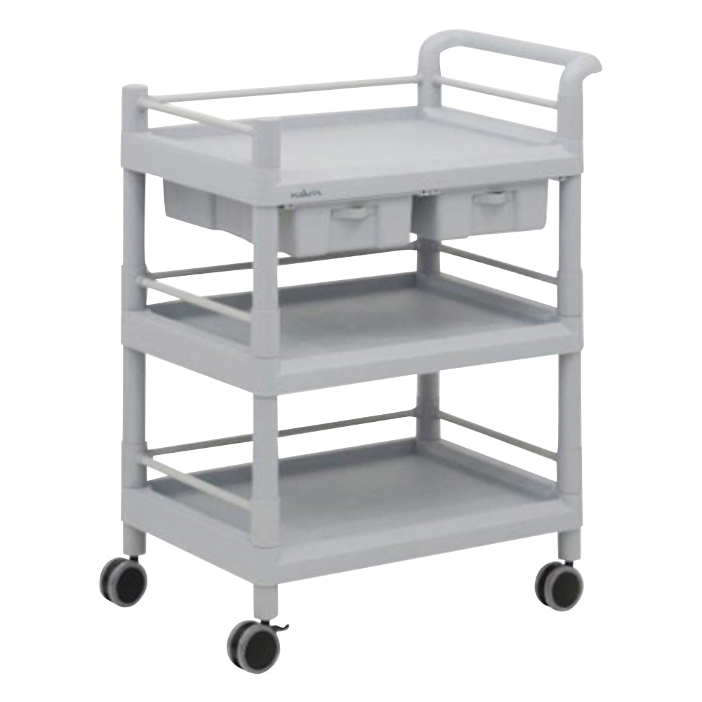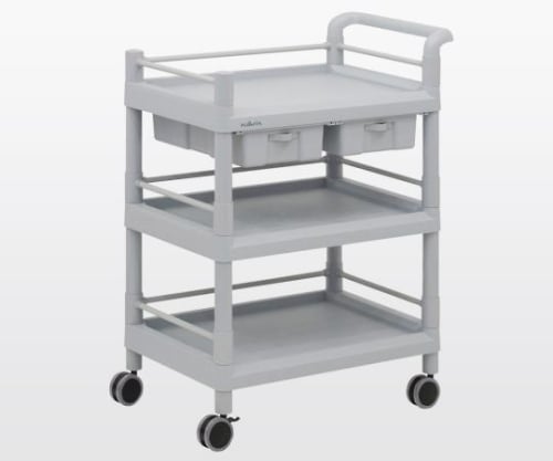 공구를 사용하지 않고 조립·분해를 용이하게 할 수 있는 올 플라스틱 카트입니다. 경량으로 견고한 디자인으로 사용이 편리하고 서랍도 2 개 붙어 있기 때문에 수납력도 우수합니다. 선반판:3단(프레임 부착) 폭×안길이×높이(mm):705×444×885 무게 (kg): 10 재질:천판·취수·인출/PP(폴리프로필렌), 지주/ABS 수지 선반 유효 크기: 553×403mm 선반 간격 (mm) (상단/하단): 140/235 캐스터:φ75mm 엘라스토머제(2륜 스토퍼 첨부) 내하중: 50kg/단 서랍내 치수:400×225×90mm 조립식