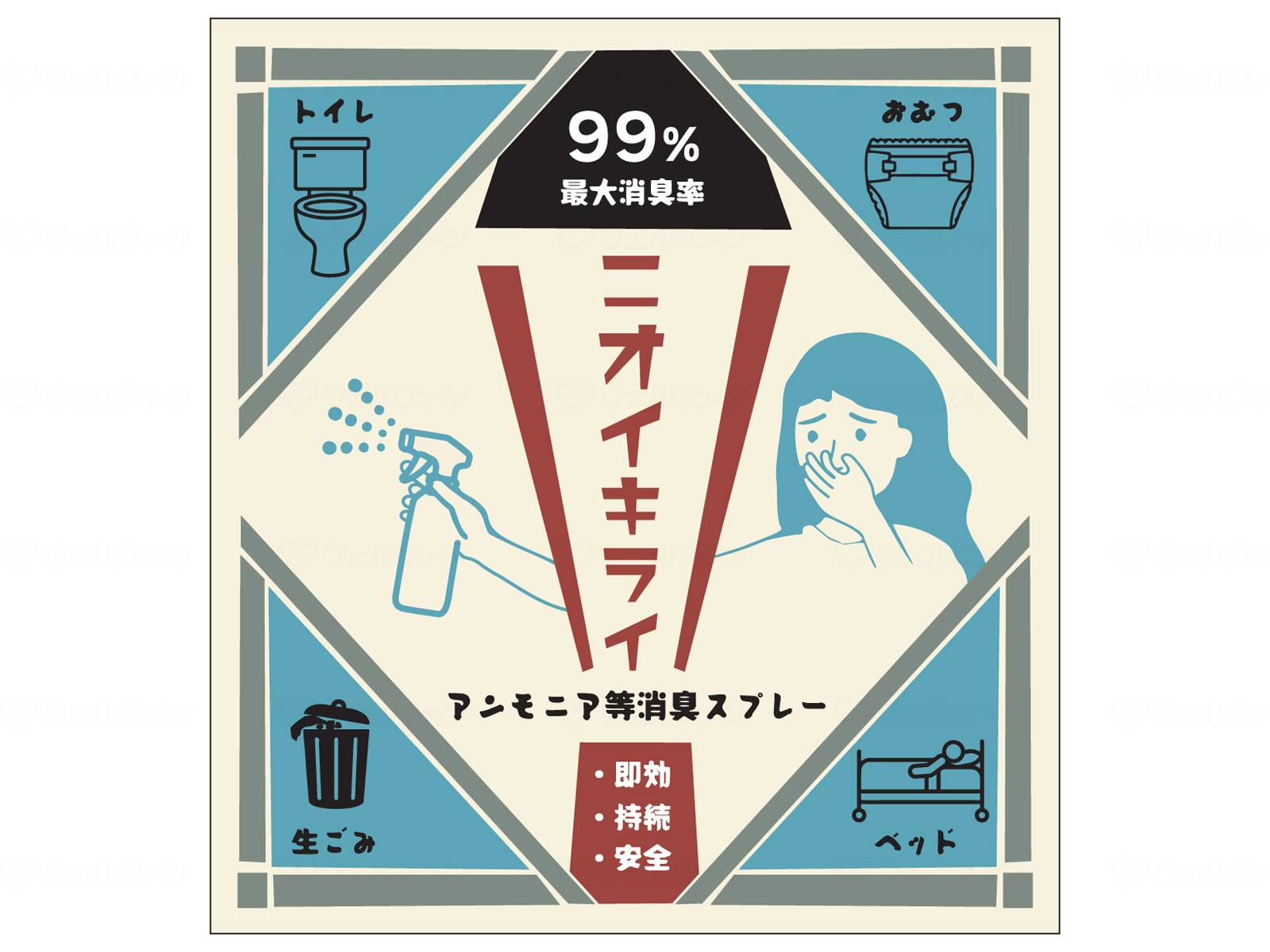 ○스프레이로, 그 자리의 우레아 냄새·땀 냄새· 음식물 쓰레기 냄새의 원이 되는 냄새 분자를 분해한다.