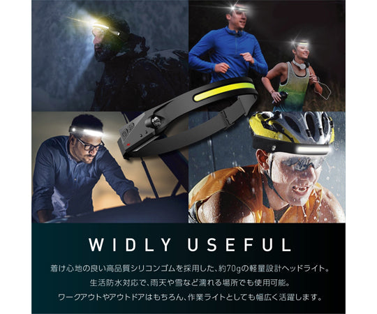 착용감이 좋은 고품질 실리콘 고무를 채용한 약 70 g의 경량 설계 헤드 라이트. 부속품:USB Type-C 충전 케이블