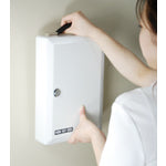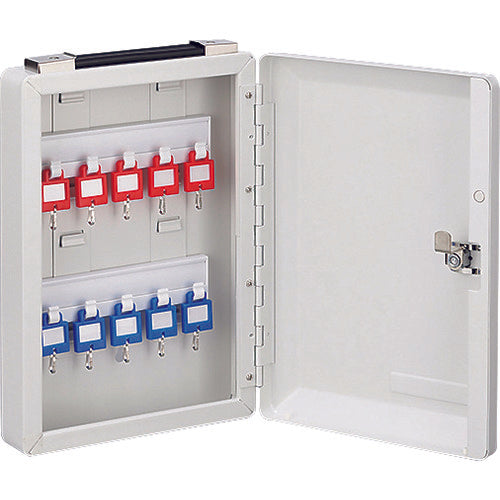 카탈로그 품번:KBP-10 특징: ●벽걸이・휴대 겸용 타입・별매의 마그넷을 사용하면, 스틸면에 설치 가능합니다. ● 문은 강력한 네오디뮴 자석에 의해 단단히 닫힙니다. 사용: ● 열쇠 관리, 분류에. 사양:●간구(mm):195●안길이(mm):60●높이(mm):282●홀더수(개):10●색:흰색●실린더 자물쇠식(키 2개 부착)