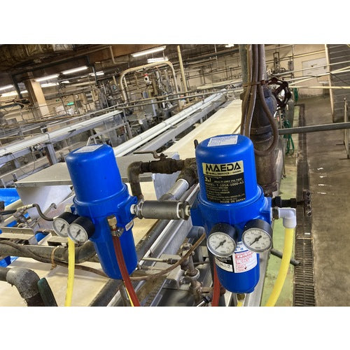 카탈로그 품번:T-110A-1000-AB 특징:●1대로 3대분의 필터 기능을 탑재한 독자 구조입니다. ●물방울・오일 미스트・0.01μm 이상의 고형 입자를 제거해, 초클린 에어로 하는 드라이 필터입니다. ●2개의 압력계 부착으로, 엘리먼트의 교환 시기를 육안 관리할 수 있습니다. ● 공구없이 간단하게 요소 교환이 가능합니다. ● 자동으로 드레인을 배출합니다. ●항균 활성화(항균 활성치 4)에 의해 엘리먼트 내의 균의 증식을 억제합니다. ● HACCP, ISO2200, FSSC22000, jfs 등 식품 관리 시스템에 대응하고 있습니다. ● 식품 이외에 의료 · 의약, 화장품 등 GMP에도 대응하고 있습니다. 용도 : ● 충전기, 포장기, 질소 발생기, 금속 탐지기, 에어 클리너, 믹서, 웨이트 체커 ● 성형기, 상자 포장기, 케이서, 슬라이서, 디패너, 이오나이저, 브렛 쿨러, 분무 ● 벗기기, 선별기, 화상 분석기, 과립기, 타정기, 린서, 물 절단 건조기 터, 잉크젯, 에어 블로우, 슬리터, ●제전 건, 에어 건, 솔레노이드 밸브, 에어 실린더, 에어 기기, 초코 정류장, 균질기, ● 병 클리너, 베르누이 척, 청소, 잔액 압출, 피그 仕様:●ろ過精度(μm):0.01●使用圧力(MPa):0.3〜0.97●処理空気流量([[M3]]/min):1.0●接続口径:Rc3/4●幅(mm):135●奥行(mm):167●高さ(mm):392●使用流体:圧縮空気、窒素、アルゴンガス●流体温度(℃):5〜60●ISO8573-1(JIS B8392-1)粒子等級1 オイル等級1●圧力計つき●除菌性能 LRV≧9●抗菌処理済みエレメントを搭載●オールインワンで圧力損失が少ない省エネ設計 材質/仕上:●筐体:アルミダイキャスト セット内容/付属品:●ブラケット●ブラケット用取付ネジ●プッシュピン 注意:●フィルター本体に衝撃を与えたり、落下させたりしないでください。 ●표시 처리 공기량・사용 압력 범위내・사용 온도 범위 내에서 사용해 주십시오. ● 오토 드레인의 보증 기간은 1년입니다. ● 본체의 라벨 · 유지 보수 그림은 취하지 마십시오. ●사용시에는 취급설명서를 반드시 읽어 주십시오.