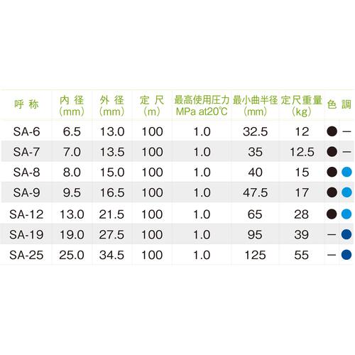 카탈로그 품번:SA-9-20 특징:●고무 호스와 비교해 가볍게 발군의 작업성이 있어, 내후성이 뛰어나 금이 깨지기 어렵습니다. 용도 : ● 컴프레서 · 자동차 정비 · 판금 도장 · 채석 등. 사양:●색:흑●외경(mm):16.5●내경(mm):9.5●최소 굽힘 반경(mm):47.5●최고사용압력(MPa):1.0●길이(m):20●사용온도범위:-5~60℃ ●사용압력:1.0MPa 재질/마무리:●연질염화비닐