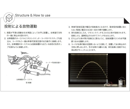 관성의 법칙이나 포물 낙하의 실험에 활용할 수 있는 공을 발사하는 대차입니다. 대차상에서 구를 투사·낙하시키는 것으로, 관성의 법칙이나 포물 낙하 운동을 알기 쉽게 나타낼 수 있습니다. 공을 발사하는 연직 방향의 조절이 가능하고, 리모콘 스위치에 의해 낙하·투사가 확실히 실시할 수 있습니다. 흑지백 눈금의 스케일이 붙어 있으므로, 스트로보 장치 등에 의한 사진 촬영에 편리합니다. 단권 가변 변압기(별도)의 전압 조정에 의해, 구를 발사하는 높이를 임의로 바꿀 수 있습니다. 대차:리모콘 스위치용 단자 부착 투사장치:AC30~50V, 투사방향 미조정장치 부착 낙구 유지 장치 : DC12V, 지주에 흑백, 눈금 플라스틱 공: 2개 크기: W300×D100×H800mm 액세서리: 캐처, 코드(리모콘 스위치 포함) ※실험에는 별도 변압기와 전원장치가 필요합니다. 상품 코드:122-120