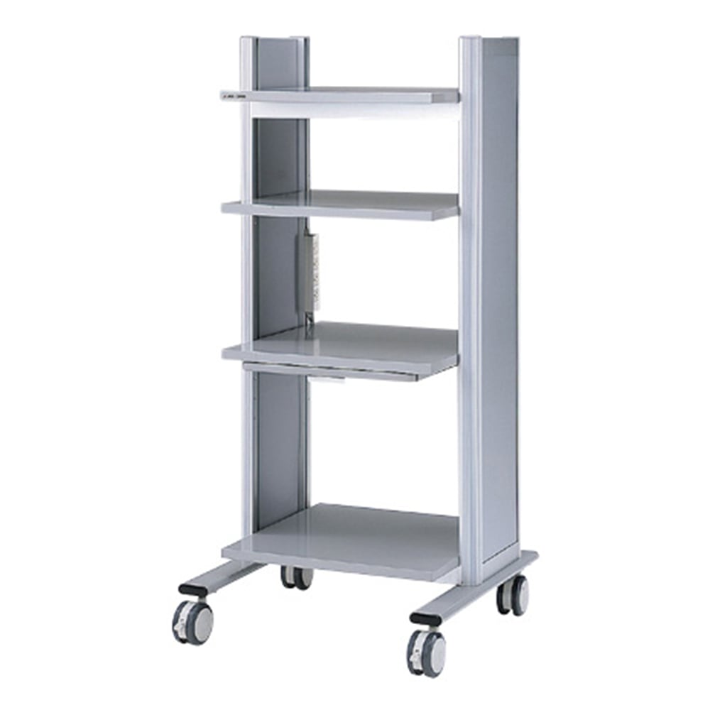 중단 선반은 50mm 간격으로 상하로 4단계 조절이 가능하며, 탑재 기기의 크기에 맞춰 선반 위치를 바꿀 수 있습니다.