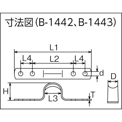카탈로그 품번:B-1442 특징:●설치 폭이 좁은 면에서도 설치 가능합니다. 용도: ● 지주나 벽면 등에의 설치에. 사양:●사용 하중(kN):0.15●D(mm):10●L1(mm):79●L2(mm):42●H(mm):18●L3(mm):17●d(mm):4.5●L4(mm):12.0●T(mm):1.2 재질/마무리:●