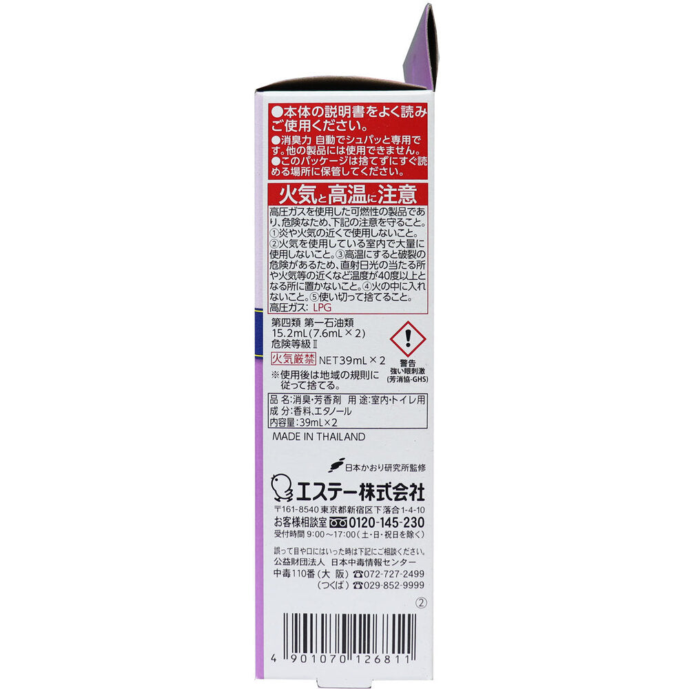 언제든지 신선한 공간 계속 ♪ 시간이 올 때마다, "슈뽀토"소취! 언제든지 신선한 공간이 계속됩니다. 트윙클 플로럴의 향기♪ 품위있는 단맛이 퍼지는 플로랄 프루티의 향기가 계속 계속됩니다. ● 일정 간격마다 자동으로 스프레이합니다. ● 방이 어두워지면 센서가 반응하여 자동으로 스프레이하는 횟수를 줄여 절약합니다. ※1회 스프레이하면, 그 후 약 15분간은 센서에 의한 스프레이를 휴지합니다. ● 손님 앞 등 언제든지 원하는 때 수동으로 스프레이 수 있습니다. ● 원하는 향기의 강도에 맞게 스프레이 간격을 3 단계로 조절할 수 있습니다. ● 교체 용 덕용 2 개 세트입니다. 【품명】 탈취·향제 【용도】 실내・화장실용 【성분】 향료, 에탄올 【사용 방법】 ※ 본 제품은 교체 용입니다. ※스프레이 캔의 세트・뚜껑의 개폐는 본체를 옆으로 해 실시한다. (1) 본체의 뚜껑을 열어 빈 스프레이 캔을 꺼낸다. (2) 새로운 스프레이 캔의 흰 선단 팁을 본체 부분에 끼워 세트한다. (3) 본체의 뚜껑을 닫는다. (4) 향기 조절 스위치를 원하는 위치에 맞춘다. (5) 가볍게 편평한 장소에 둔다. ※원 푸시 버튼을 눌러 스프레이하는 것을 확인해 주세요. ※전지는 부속되어 있지 않습니다. 【응급 처치】 만일 눈에 들어갔을 경우나 피부에 묻은 경우에는 충분히 물로 씻어내어 모두 의사와 상담한다. 【주의】 ・사용이 되기 전에, 본체의 취급 설명서를 잘 읽어 주세요. ・자동으로 슈퍼와 전용입니다. 다른 제품에는 사용할 수 없습니다. ・분무구에 얼굴을 접근할 수 없다. ・유아나 애완동물의 장난에 주의한다. ・분사구에 이물질을 넣거나 막히지 않는다. ・본체에 충격을 주거나 분해, 수리, 개조는 절대로 하지 않는다. ・오동작의 원인이 되므로 안전 스위치에 닿지 않는다. ・용도 이외에 사용하지 않는다. ・장시간 사용하지 않을 때는 전지를 꺼낸다. ※화기와 고온에 주의.