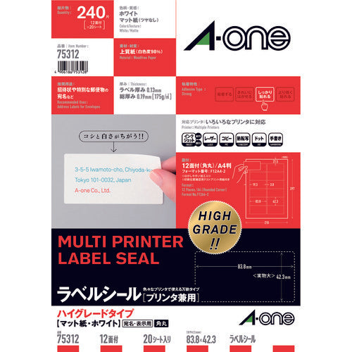 3M 에이원 라벨 씰 하이그레이드 표시・패키지・수명 라벨 프린터 겸용 매트지 흰색 A4 12면 1봉(20 시트입) 75312 75312 1PK