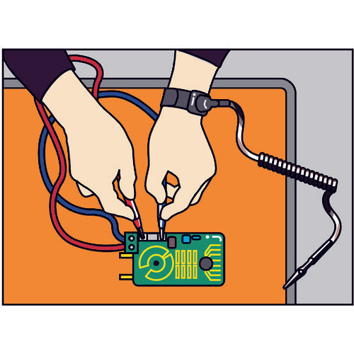 카탈로그 품번:AS-101-6 특징: ●매직 테이프식의 리스트 스트랩입니다. 용도 : ● 반도체 공장 · 정밀 기기 조립 작업에서 정전기 제거. 사양:●코드 유무:유●코드 유효 길이(m):1.8●코일부 길이(cm):16●색:블랙●그랜드 코드 길이(m):1.8●코드 전장(cm):43●바나나 플러그, 악어 클립 클립 부착 ●1MΩ 저항 내장 그랜드 코드 구리 ●플러그:철(니켈 도금)