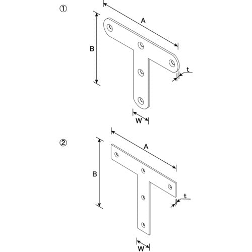 카탈로그 품번:00063099 특징:●T자형의 플레이트 타입의 보강 금물입니다. ●녹에 강한 스테인리스제입니다. 용도 : ● 연결 및 보강에. 사양:●판두께(mm):0.9●W(mm):13.0●L1(mm):57●L2(mm):50●홀 직경(mm):3.4●홀수(개):5●타입:R 부착