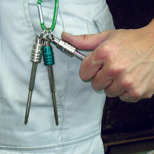 카탈로그 품번:DR-62 특징:●한 손으로 비트를 착탈할 수 있습니다. ● 전기 공사 작업에 최적입니다. ● 소지의 카라비나와 사용하시면 더욱 편리합니다. ● 2개의 볼로 확실하게 유지하기 때문에 안전합니다. 사양:●색:그린●전장(mm):35●직경(mm):14●직경:14mm