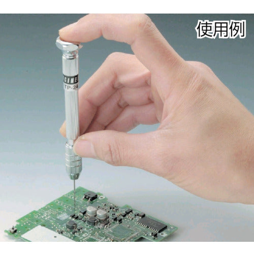 카탈로그 품번:TP-23 특징:●프린트 기판의 드릴링, 정밀 부분의 가공용으로서 드릴・탭등을 유지해 다용도로 사용할 수 있습니다. 용도 : ● 드릴, 탭 유지에. 사양 : ● 적합 사이즈 (mm) : φ0.1 ~ 3.2 ● 전장 (mm) : 105 ● 적요 : 양두 양구 ● 적응 사이즈 (mm) : φ0.1 ~ 3.2 ● 양두 양구 타입 재질 / 마무리 : ● 황동, 특수강