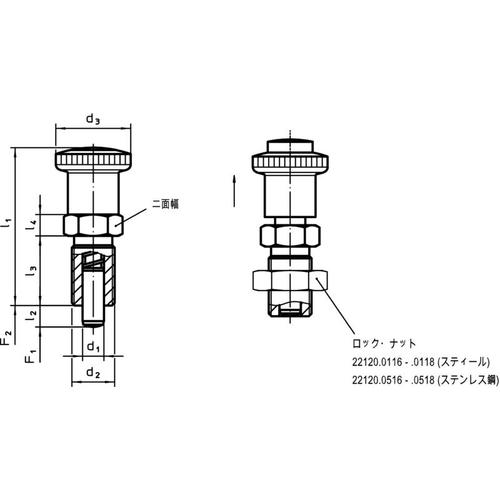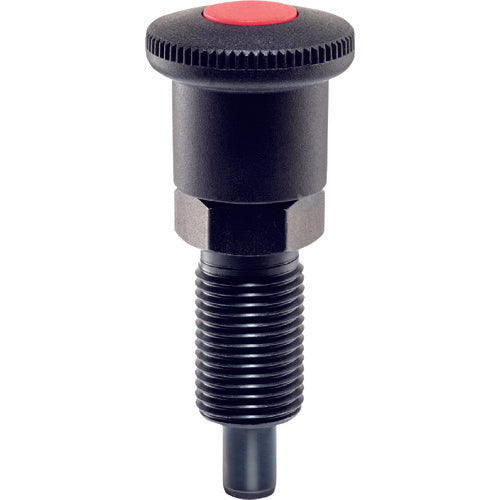 카탈로그 품번 : 22122.0220 특징 : ● 노브를 당기면 핀이 끌린 상태로 고정됩니다. ● 빨간 버튼이 튀어나온 상태는 잠겨 있음을 나타냅니다. 빨간색 버튼을 누르면 잠금 핀이 원래 위치로 돌아갑니다. ● 잠금을 쉽게 할 수 있습니다. 용도 : ● 인덱스, 슬라이드기구 등의 잠금, 위치 결정에. 사양:●나사 치수:M16×1.5 ●전체 길이(mm):71.5 ●핀 지름(mm):8 ●핀 길이(mm):12 ●외경(mm):30 ●내열 온도(℃):80 재질/마무리: ●본체: 스틸(흑염) ●푸시 버튼:POM(적색) 록 너트는 별도 판매입니다.